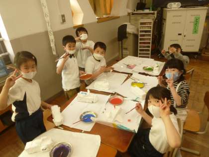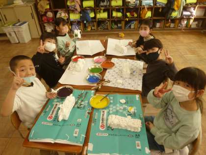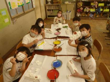 乾いた紙粘土に色をぬりました。細かいところもとても上手にぬることができていたので驚きました。形や色の工夫をしながらグループで楽しく活動することができました。