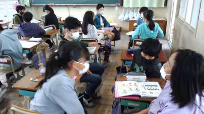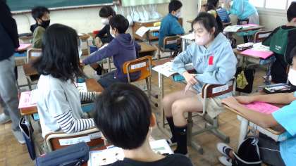英語の学習は近藤先生と行います。どんな学習をするのか,中学校で求められる英語の力はどんなものなのかを確認しました。その後は,場面に応じた『see you』の言い方,アルファベットの確認をしました。