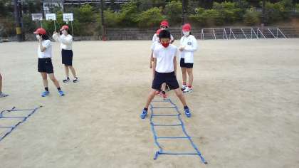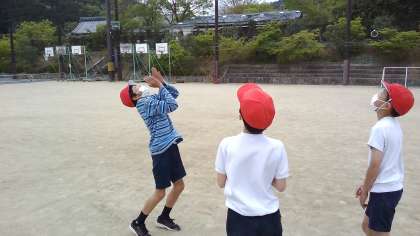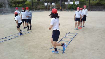 体育では体ほぐしの運動をしています。体の柔らかさや跳ぶ,投げる,ひねるなどの運動を行い,自分の体の状態を感じたり,友だちと交流したりしながら運動を楽しみました。