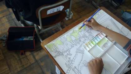 図工「わたしの大切な風景」は彩色に入りました。いくつかのポイントを意識しながら丁寧に塗っていきます。