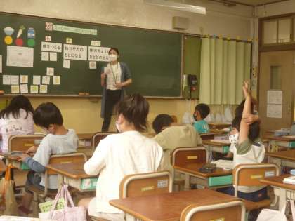 4時間目の時間に栄養教諭の谷村先生に授業をしていただきました。テーマは「食べ物の三つのはたらきについて」です。食べ物のイラストを黒板にはったり,色分けを子ども達と一緒にやったりして分かりやすく教えていただきました。今日の献立は「カレーライス」だったのですが,「ジャガイモは何色だったかな。」という声が聞こえてきました。
