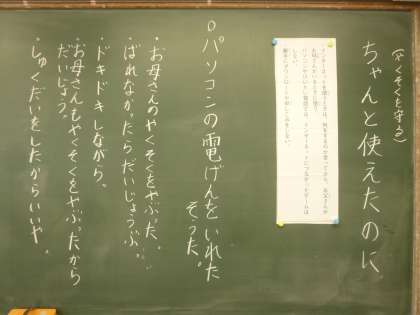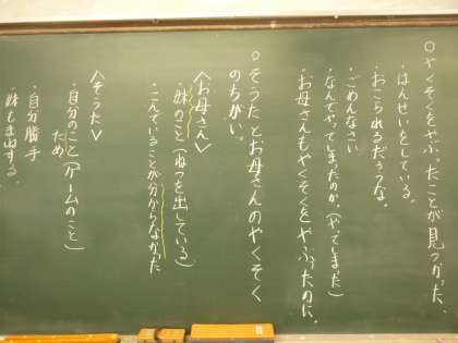教材を通して,約束を守ることについての大切さを学びました。約束をやぶってしまった後にどのような気持ちになってしまうのか,そして「約束をやぶった」内容の違いについても話し合いました。子ども達はふりかえりにそれぞれの登場人物の気持ちをしっかりと考えることができました。