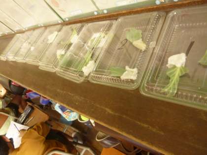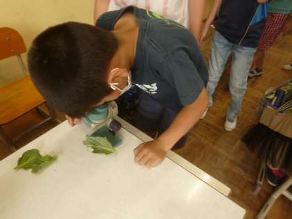 今日はモンシロチョウの幼虫の観察をしました。殻をでたばかりの幼虫に出会えたので,みんなで観察をしました。