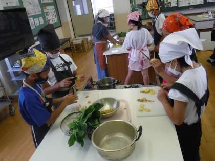 今回はゆで芋とほうれん草のおひたしを作り,ゆで時間の違いやゆでる前とゆでた後の違いについて学習しました。