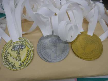 明日は同じくタグラグビーを学習した5年生とタグラグビー大会を行います。10チームで行い,メダルも完成しました。
