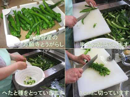 夏野菜には京都府産の万願寺とうがらしとなすを使っています。万願寺とうがらしは「とうがらしの王様」と言われるほど,大きく甘いのが特徴です。