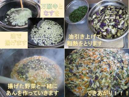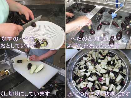給食室では,夏野菜を油で揚げて,鶏ひき肉・にんじん・玉ねぎを炒め煮しているところに一緒に合わせて,片栗粉でとろみをつけています。教室ではごはんにかけて食べます。だしの風味もきいているので,ご飯と一緒にパクパク食べて,夏野菜のおいしさを味わって食べていました。