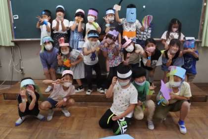 いろんな材料を使って輪を飾り付けました。今日は完成した作品を身に着けて記念撮影をしました。
