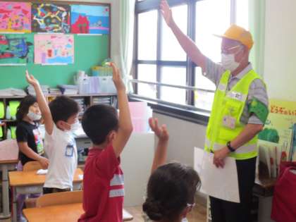 車に目と手で合図をすることを繰り返し練習しました。