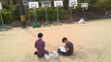 図画工作科の学習で,絵の具セットを外に持ち出して,様々な形に破いた段ボールや画用紙に風景を描きました。