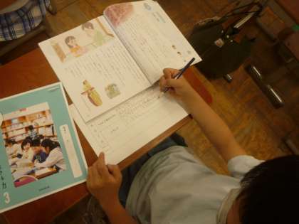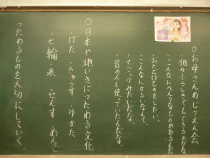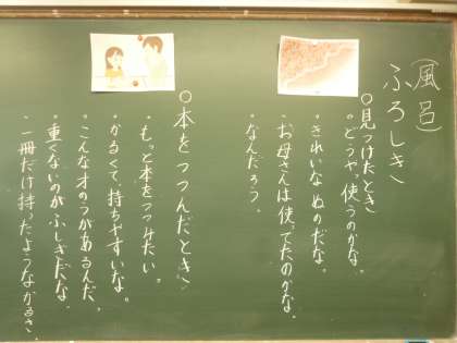 今回のねらいは「風呂敷の実演をみて,そのよさに興味をもった主人公の気持ち考えることを通して,伝統のよさに気づくこと」です。子ども達は教科書を読んで,実際にふろしきで包んでいる様子をみると,伝統のよさにみんな気づき,それをノートに書いていました。もし,お家に「ふろしき」があれば,ぜひいろいろなものを包んでみてください。