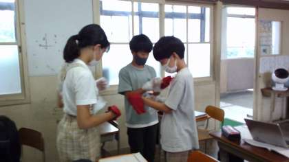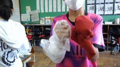 夏を快適に過ごすための衣服の着方の学習で、今回は布の性質を比べてみました。手を布でおおう方とポリ袋でおおい、吸湿性を感じてみました。結果は一目瞭然、ポリ袋に入れた方の手は汗ばんでいました。