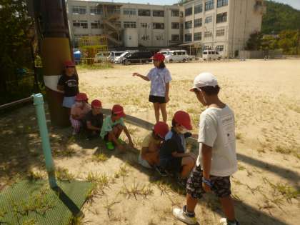 おにごっこをして理科の問題作りをしています。午前中と午後に行った「かげふみおに」影をふんむときに,みんなあることに気づきました。それを交流した後に,さっそく理科の問題作りをしました。「どうして影は同じ向きにできるのだろうか。」「時間がたつとどうして影の向きが変わるのか。」「太陽の位置と影は関係あるのか。」など,これから楽しく問題を解決していきたいです。