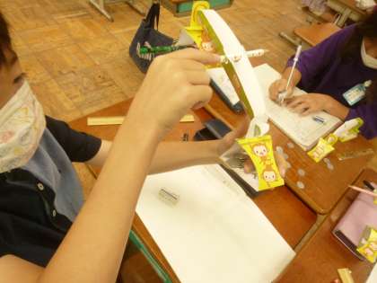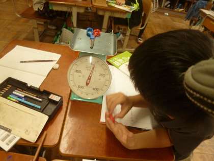 算数科では「重さ」の学習が始まりました。はじめに一円玉で重さをはかり,「一円玉がなん枚か。」で比べていました。次は秤をつかっての学習です。1目盛は何グラムなのか,正しく計るにはどうするのかをしっかりと確かめて計りました。