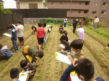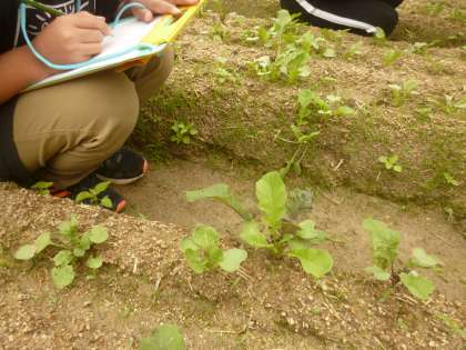 大根の芽がでました。それぞれの種類の大根の芽に、形や大きさの違いがあり、子ども達はそれを真剣な眼差しで記録していました。再来週に間引き・草引きなどの活動があります。それまで元気にそだってほしいですね。
