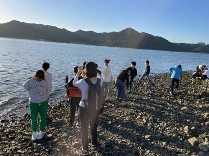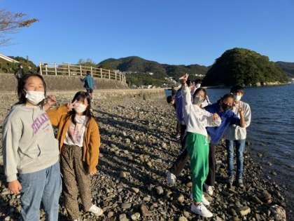 海に向かって石を投げたり、水切りしたり、石を積んだり、カニを探したり、いろいろと楽しんでいました。