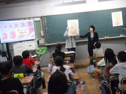 おなかの中にいるときの赤ちゃんの心音を聞いたり,生命の誕生した時の実際の大きさを見たりするなどして学習を進めました。