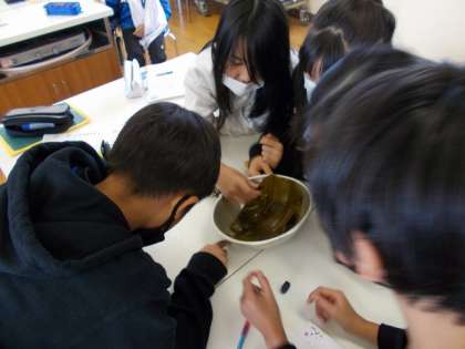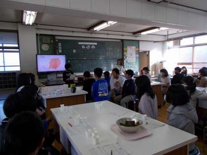 五感を使ってだしを味わい、だしのよさやひみつ(効果)をみつけました。煮干し、鰹、昆布を使ってとっただしを試飲しました。だしのもつ本来の「旨味」を感じつつも、苦手なだしの味もあったようです。次回は、このだしの「旨味」をいかして「みそ汁」の調理を学習します。