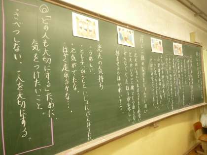 こころの日の道徳では「同じなかまだから」の物語を読んで学習しました。運動会の場面の物語だったのですが、運動の苦手な子がチームにいたらどうするのかをいろいろな立場で考えることができました。最後には、「仲間外れを作らずに、みんなで参加したほうが気持ちがすっきりする。」という仲間を大切にする意見がたくさんでました。