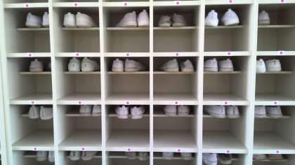 6年生の下駄箱です。上が上靴、下が下靴。しっかりとそろっています。もっときれいにできるといいなと思います。