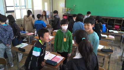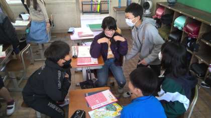 今日は算数と国語の学習をしました。国語では4、5人のグループで文章を一人1文ずつ順につないで2周する間にお話を作りました。