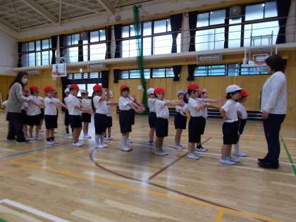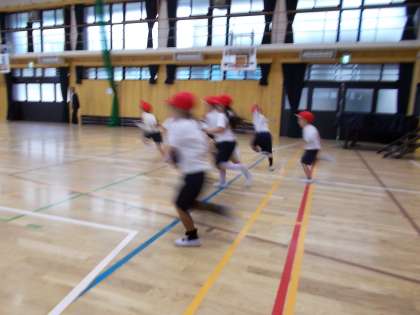 体育の授業,講堂で鬼ごっこをしました。