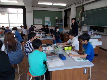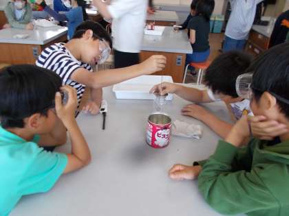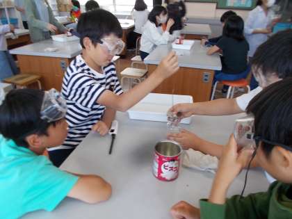 理科で空気の成分についての実験をしていました。集気瓶でロウソクを燃やした後、瓶の中に何が残っているか石灰水で調べていきました。