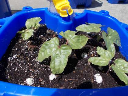 運動場に出てみると、みんなでまいたアサガオの種から芽が出て葉も開きました。