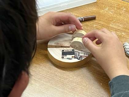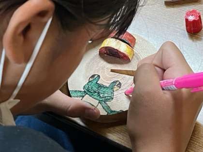 花背山の家のマスコットキャラクターの「ハナコロ」や行き帰りにお世話になる「バス」など、山の家の思い出をウッド写真たてに表現していました。