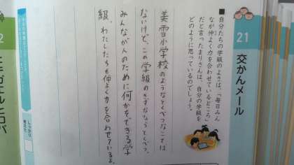 今日のテーマは「学級のよさを見つけることから自分たちの学級や学校のよさをあらためて考え、協力して楽しい学級や学校をつくろうとする。」です。お話の内容は、学校の良さを他校と交流していたら、北海道の小学校は10月に雪が降ったり体育にスキーがあったりと大きな特色がありました。主人公は「特別なこと」がないことに気付きましたが、自分たちの学校や学級の「よさ」に気づき、それを紹介して交流することができました。