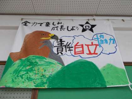 教室には花背山の家行のために作った旗が飾られています。
