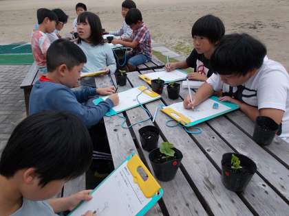 雨の多い季節となり植物がよく育ちます。4年生はツルレイシの観察をしていました。