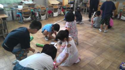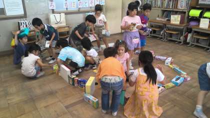 算数で使った箱を、みんなでつなぎ合わせたり、積んだりしました。