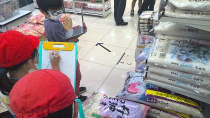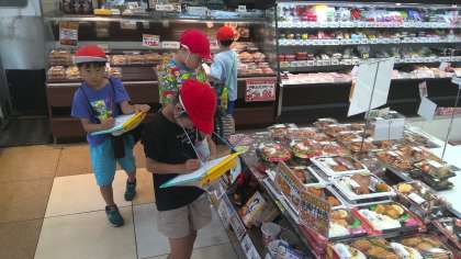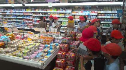 社会の学習でスーパーマーケットの「生鮮館なかむら」に行き、お客さんに来てもらうためにどのような工夫をしているのか見学しました。子どもたちは「売り場を同じ種類でかためている」「物がなくならないように、売場に商品を足している」と工夫に気づくことができていました。