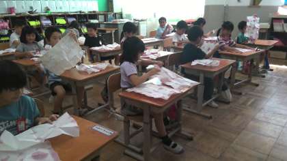 折った和紙に色をつけて、広げたときの模様を楽しみました。