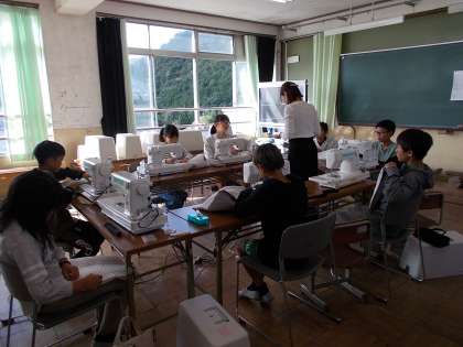 家庭科の授業で、ミシンで手提げバッグを縫っていました。