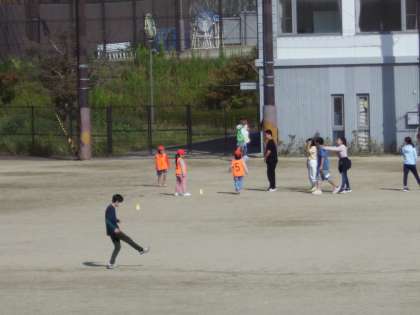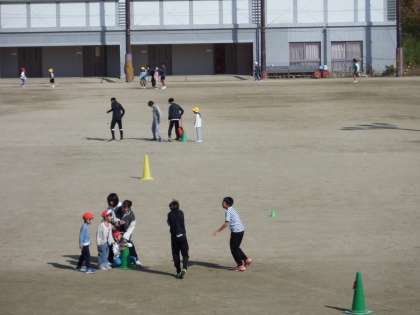 1年生と6年生が、運動場で楽しく交流をしていました。