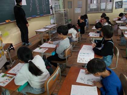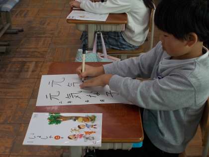 書き初めの練習です。「元気な子」とフェルトペンで書いていました。