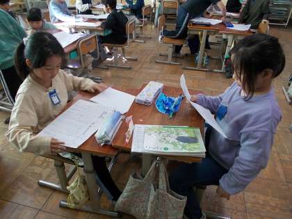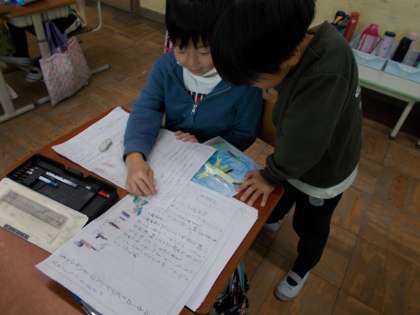 国語の授業で、それぞれが考えた「おもちゃの作り方」を互いに交流していました。