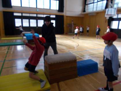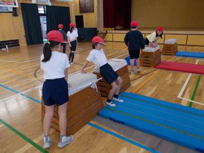跳び箱で、台上前転や横抱え込み跳びの練習をしていました。