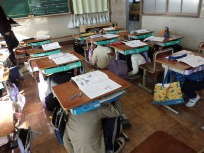 避難訓練の時の様子です。速やかに、机の下に入っていました。