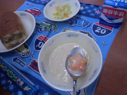 今日の給食「豆乳のクリームシチュー」の中には、各クラス1つずつラッキーにんじんが入っていました。可愛い星型のにんじんに喜んでいました。