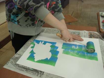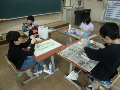 図工の学習の様子です。ローラー版画では、自分の好きな色を選んで、刷っています。「わあ、できた!」と楽しみながら活動していました。
