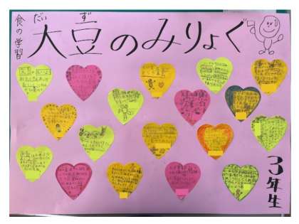 今日は3年生で食の学習「大豆のみりょくを伝えよう」を行いました。