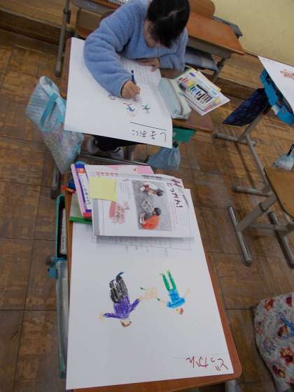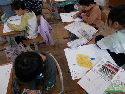 国語の授業の様子です。いろいろな遊びについてみんなに説明するための発表原稿を、絵と文でまとめていました。