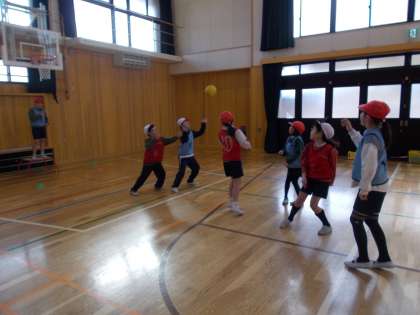 体育の授業で、ポートボールをしていました。試合の間には作戦会議をしています。