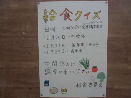 写真下:給食委員会からのお知らせです。20・21・22日の中間休みにクイズがあります。みんなで楽しみましょう。