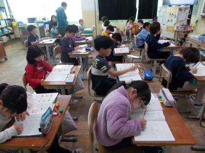 算数の授業の様子です。箱の形の頂点と辺がいくつあるか調べています。