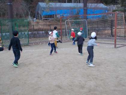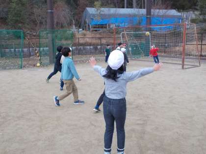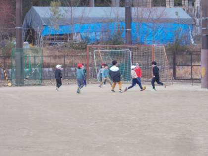 1年生と4年生が一緒にサッカーをしていました。仲良く遊んでいる姿に微笑ましく思いました。