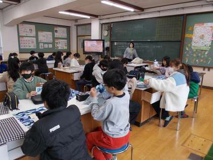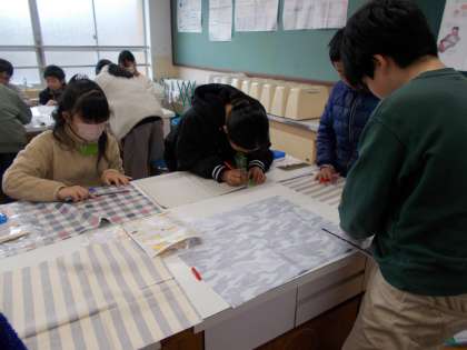 家庭科の実習で、ランチョンマットづくりをしていました。